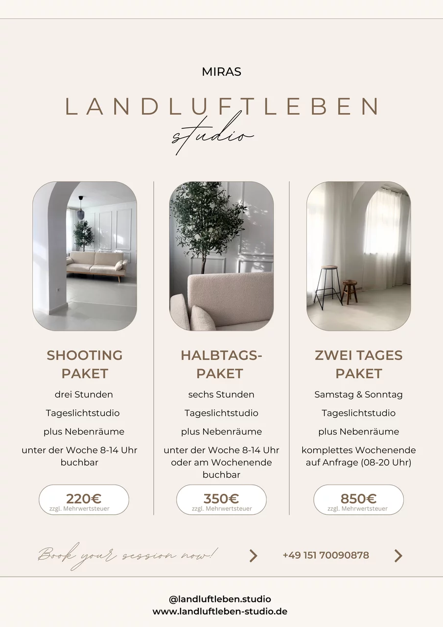 Das Studio nutze ich selbst für meine Projekte und öffne es bewusst für andere Kreative, die ähnliche Werte teilen: Qualität, Ruhe, Ästhetik und echtes Arbeiten statt schneller Kulisse.